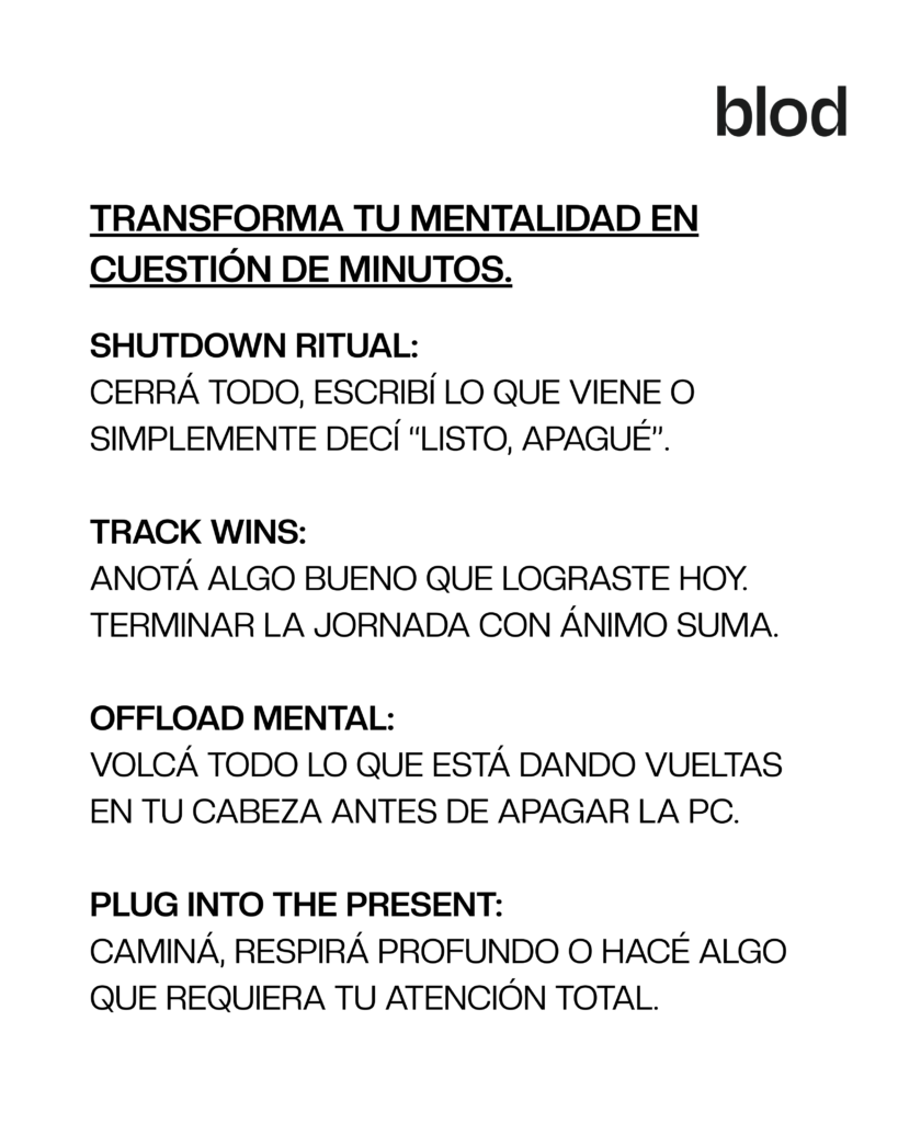 No siempre está en la hora que marca el reloj ni en cerrar la laptop. A veces el verdadero cierre del día pasa por un gesto, un cambio interno que te dice “ya está, ahora soy otra versión de mí”. El método STOP propone eso: una transición consciente que no solo corta la jornada, sino que le da un sentido.